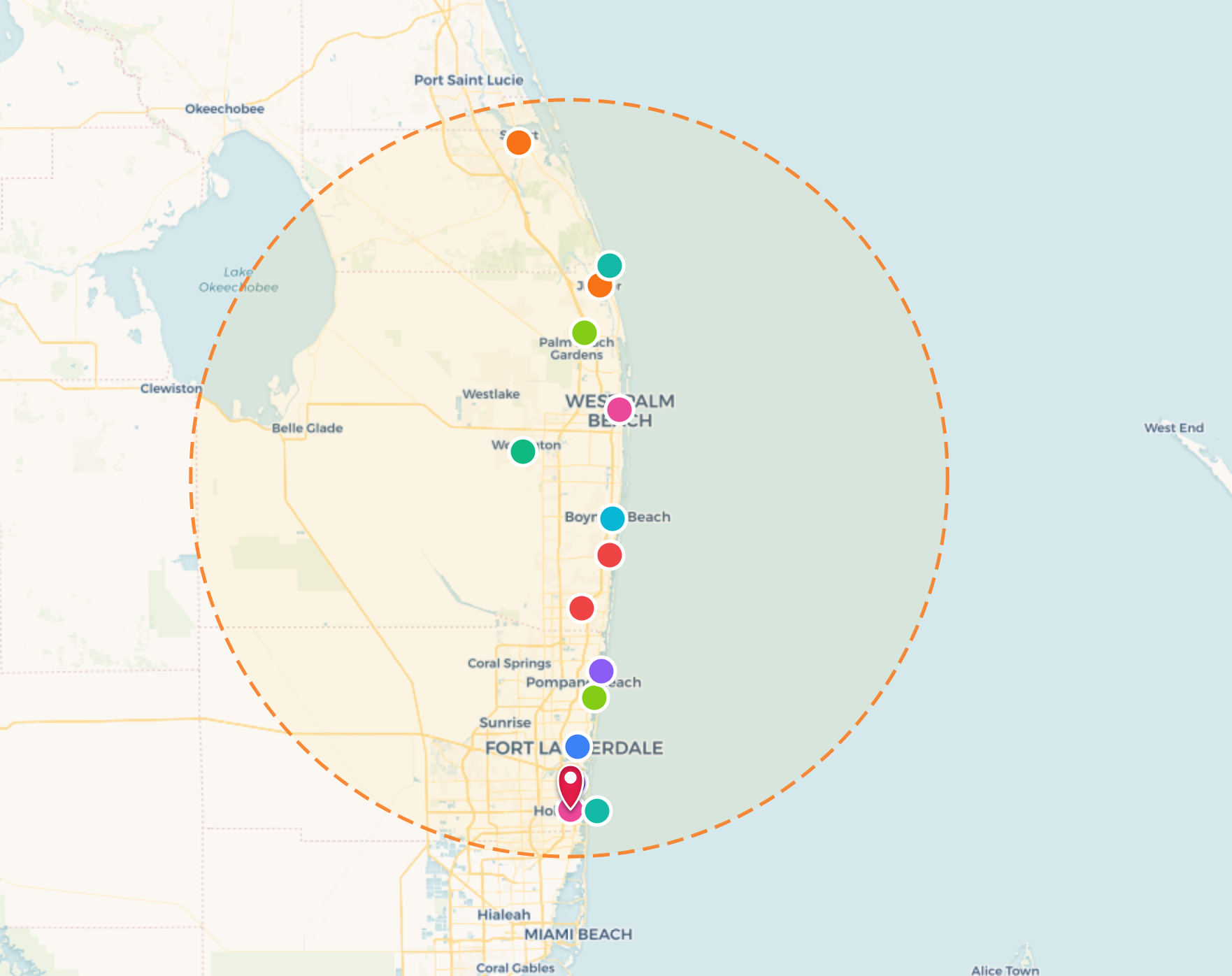 Hollywood, and all of Palm Beach, Martin, and Broward Counties